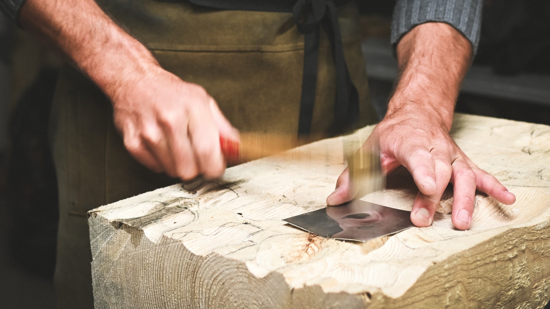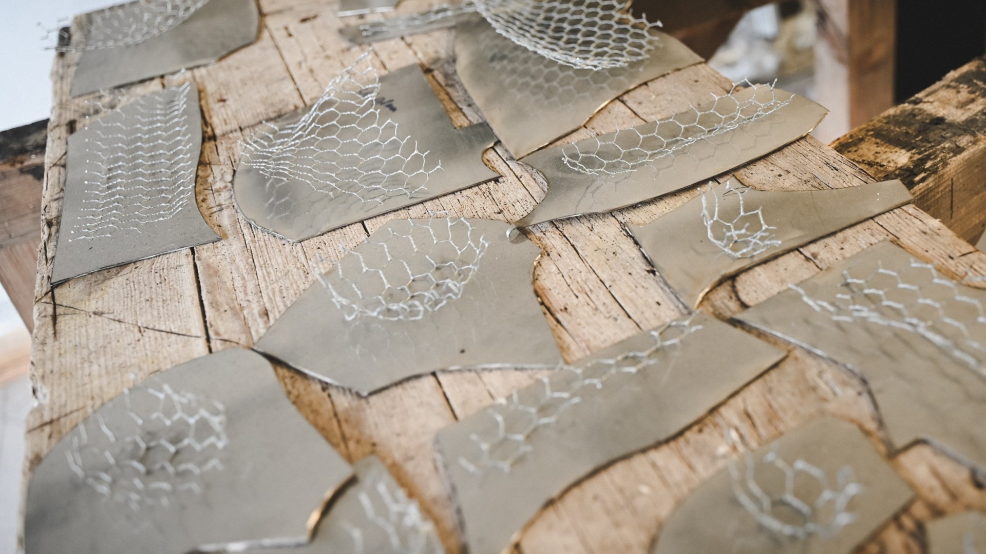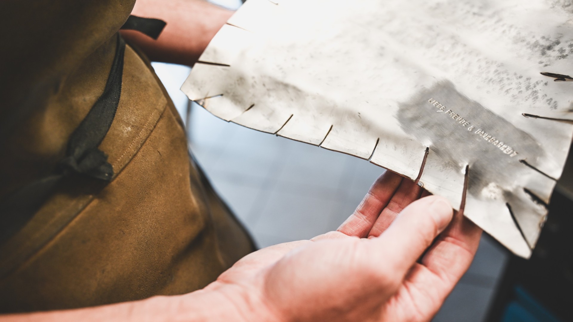 Mit einem Stahlnetz nimmt er die Form dann in Einzelteilen ab und fräst sie als Negativ in Holzblöcke. Auf diese Holzblöcke legt er anschließend dünne Edelstahlbleche und klopft sie mit einem Hammer behutsam in die richtige Form. Holz übrigens deshalb, weil es weich ist und so dafür sorgt, dass der Edelstahl beim Hämmern nicht beschädigt wird.
