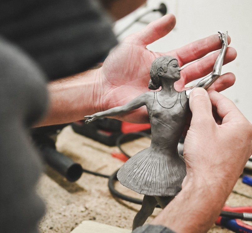 Friedrich wendet übrigens nicht ausschließlich diese Vorgehensweise an – er passt sich vielmehr der jeweiligen Skulptur an: Die „Abstrakte Frau“ hat er beispielsweise im Kleinformat vor-modelliert und anschließend mit Licht vergrößert an die Wand projiziert, bevor er sie aus Edelstahl nachgeformt hat. Um trotz ihrer kleinen Größe ins Detail gehen zu können, hat Friedrich die „Ballerina“ hingegen aus Vollmaterial gefertigt. Sie ist also innen nicht hohl und damit sehr viel schwerer, als ihre Größe vermuten lässt.
